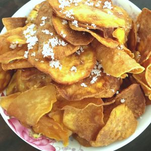 芋头去皮 洗净 切薄片 越薄越好 也可以借助擦皮器 伙伴们用刀要注意安全哦