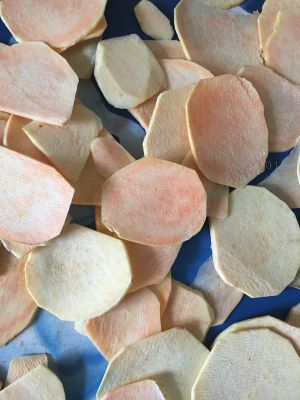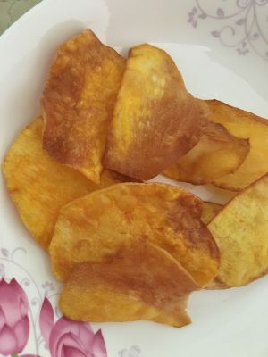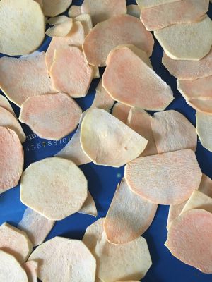 切薄片后洗下 不急着吃的话可以风干下如图 或用厨房的吸水纸擦下 表面没什么水就行 防止溅油 安全第一 越薄炸出来才会越脆
