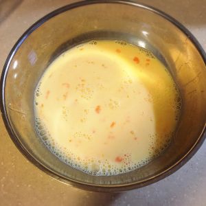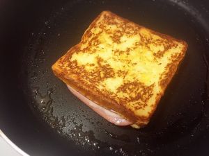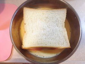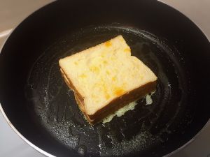6、放入吸飽湯汁的吐司,小火慢慢煎。