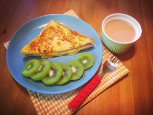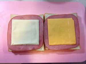 2、兩片吐司分別鋪上火腿片➕芝士。