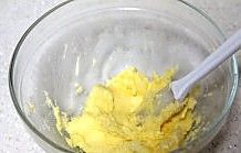 黄油在室温内软化后,放在略深的器皿中,加入糖粉和盐,用刮刀轻轻搅拌均匀
