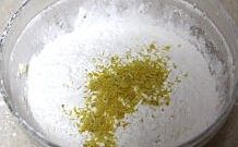 将高粉和玉米淀粉混合后筛入黄油中,加入柠檬皮屑,用刮刀上下翻搅均匀后盖保鲜膜,入冰箱冷藏25分钟