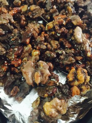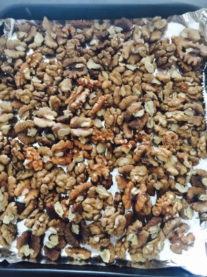 敲了很久的核桃仁,也可以买剥好的,放烤盘里平铺,入烤箱180度15分钟(根据自家烤箱的脾气适当调整)没有烤箱可以用炒锅炒,皮掉了就好啦……