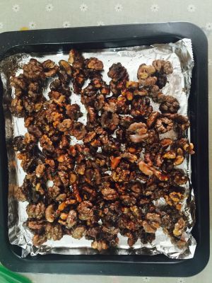 放盘子里平铺凉凉,就可以美美哒吃啦,也可放些芝麻,家里木有了就没放,放芝麻的话在核桃刚出锅的时候撒上拌匀就好啦