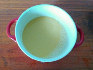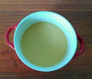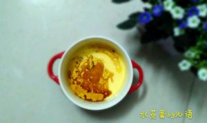用筛子把气泡滤掉,或者用勺子撇掉,处理好的蛋液也可根据自己的喜好再洒点虾皮