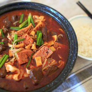 将除了豆芽以外的配菜都放进去,翻动下,煮大概5-10分钟。