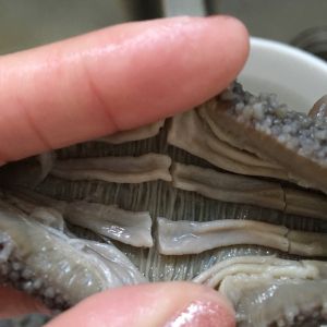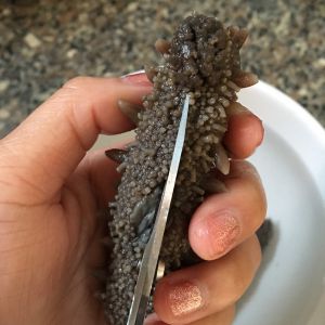 ☆浸泡后的海参变大,表面回软,这个时候取剪刀,把海参从腹部沿两端剪开,清洗海参肚内杂质。