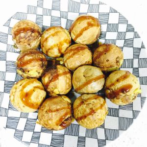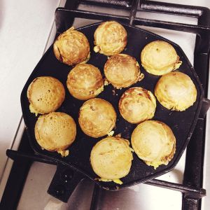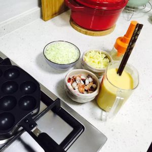 然后再圆凹槽里倒三分之二调配好的蛋液➕章鱼粒➕芝士➕卷心菜。再用蛋液铺满整个锅。这样的章鱼烧才会又大又圆哦!