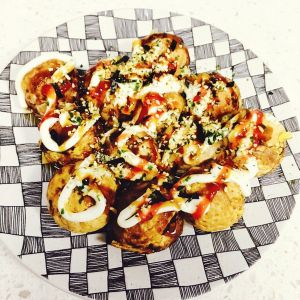等他胖胖圆圆的时候。铺满照烧酱!➕番茄酱!➕美乃滋➕再铺一层照烧酱!加上海苔!白芝麻!还有!柴鱼烧!美味的小丸子出锅啦!