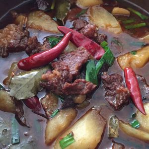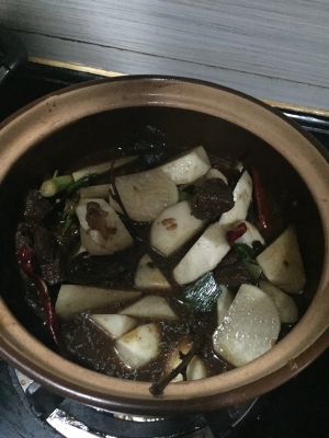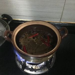 把压好的牛腩和汁倒入砂锅中火慢慢熬,加入豆瓣酱、红辣椒、老抽、冰糖。