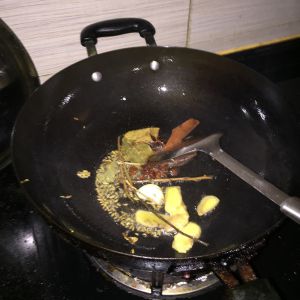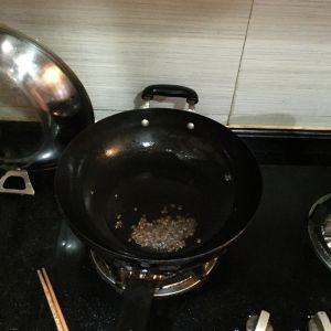 锅里烧热油放入花椒炸出香味,捞出花椒。