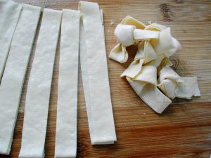 豆皮切合适的宽条,打成结