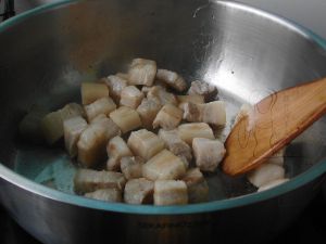 锅里加点儿油烧热,把五花肉煸炒出油至微焦黄