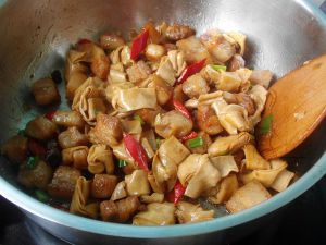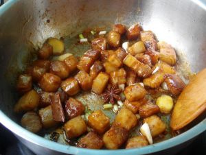 再加葱、蒜、姜、八角、桂皮和适量盐炒匀