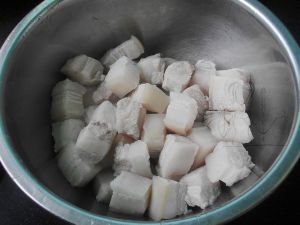 五花肉切方块,焯水