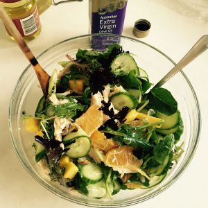 黄瓜切薄片,和混合生菜叶一起放进碗里。我买的黄瓜超级粗长,食物用量你们自己看着办。
