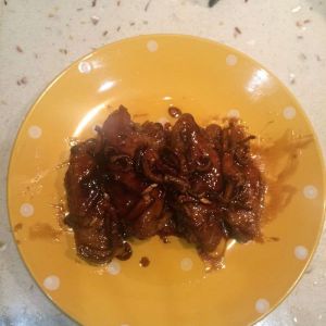 煎好了加一勺料酒 。生抽 。海鲜酱油 。爆一下 。其实加一点老抽也行 。但颜色特别容易深 。所以我没加 。。生抽可乐海鲜酱油的颜色就够了 。。