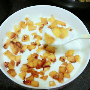 将黄桃丁均匀的撒在成品上,等晾凉后放入冰箱(当然也可以当时就吃,因为小妹爱吃凉的就了放进冰箱的保鲜层)