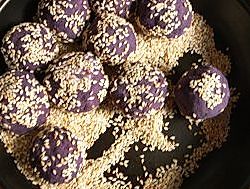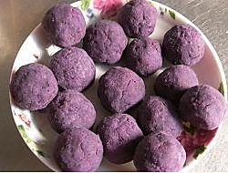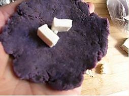 取紫薯小团放平在手心加奶酪二小块揉捏成团。