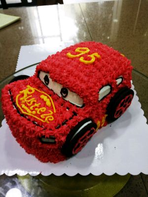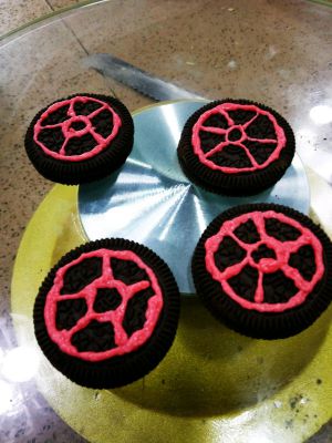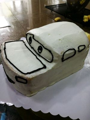 酱紫!用巧克力在表面画出车窗跟头灯!然后再打淡奶油,调成红色后准备挤!