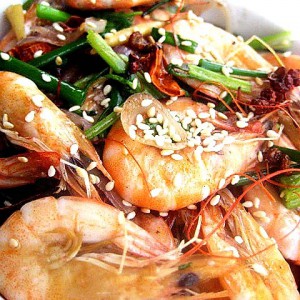 鲜虾放下热油锅,翻炒至虾变红装盘备用(正宗的做法是先把虾炸熟,我一般是炒熟,这样的话夏天吃就不会上火)