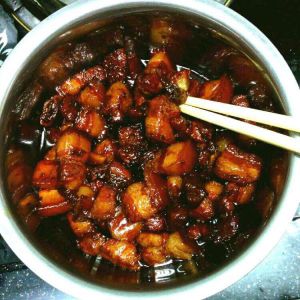 锅中放入少量的油,倒入五花肉炒两三分钟,盛出肉,留适量的油小火把冰糖炒至融化,放入五花肉炒均匀,倒入生抽老抽料酒,翻炒至上色,锅中放入冷水淹没五花肉,放入生姜,八角,大火煮开,中小火煮40-50分钟,放入适量的盐,出锅前大火收汁,美美的出锅啦,是不是看起来很有食欲呢。嘿嘿