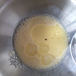 鸡蛋打散,加入牛奶,糖,玉米油,蜂蜜搅拌均匀
