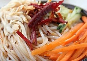 将米线在温水中浸泡1小时以上,黄瓜和胡萝卜分别切细丝