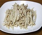 将煮熟的鸡脯肉捞出后迅速浸泡在冰水中,待冷却后沥干水分,用刀的侧面拍松后撕成鸡丝