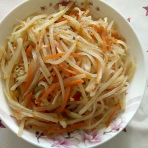 把胡萝卜和土豆各切丝,爆香蒜和辣椒