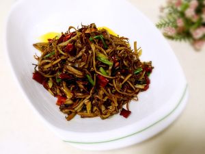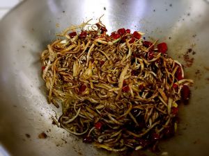 翻炒、翻炒、翻炒~一直将水分煸干,再下辣椒段