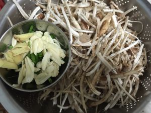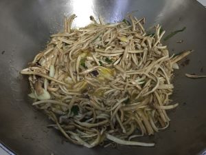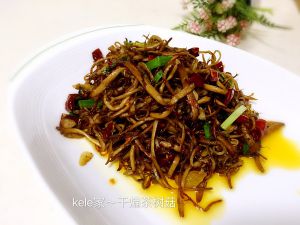 茶树菇清洗干净撕成丝,姜、蒜切片、葱切段