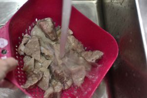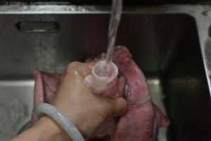 买回来的猪肺从喉管地方用活水不断灌洗将猪肺里面的血水排除干净