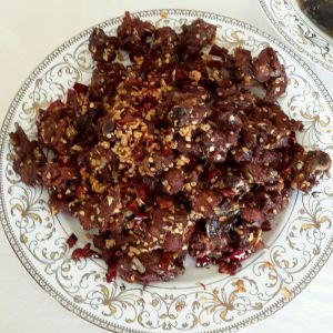 热锅加油放入花椒,辣椒,蒜末,姜末,放入炸好的鸡,“腌制过成中味道充分,炒的过程中不需要放盐”