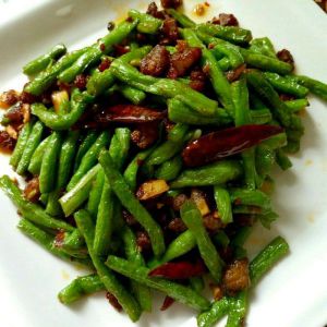 放入炸好的四季豆快速翻炒,依据各人口味,加入适量的糖或者盐调节一下口味,出锅,装盘。