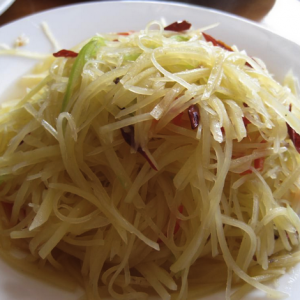下土豆丝,大火翻炒,并加入盐,糖,1/4汤匙醋,下青椒,炒均匀关火,余温放剩下的1/4醋,一茶匙香油即可
