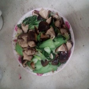 起油锅,放入蒜片爆锅后倒入先前洗好的香菇翻炒,火稍微调小一点,可加点水以防粘锅底。
