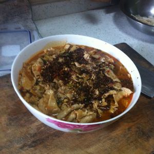 花椒辣椒小火加热烘干,碾碎,铺在肉上,越碎越香。锅里加入油,烧开,淋在铺好的花椒辣椒上,香味四溢,水煮肉片出锅!