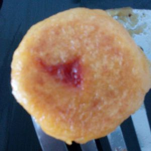 把面团分成小剂子,压扁包上番茄酱,再拍扁(本人手工比较差,大家见谅哈)。平底锅倒入调和油烧热,下锅小火煎熟。
