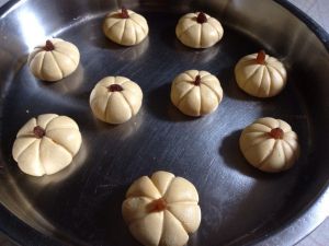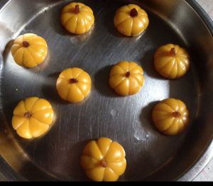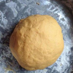 蒸熟放凉的南瓜压成泥,和白糖搅拌均匀,分次加入糯米粉,混合,南瓜不足可以用蒸南瓜的水混合搅拌。直到不黏手。(可以放一点点面粉,以免太软不成型)