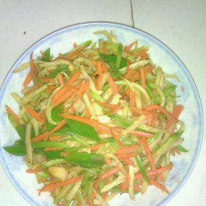 锅内放油,多一点。大火,油热后,先放入葱姜蒜煸炒,出香味放入三丝,快速煸炒。看食材七八成熟,放一小勺盐,适量十三香,继续煸炒,炒熟放葱叶,一点点味精、酱油翻炒出锅。