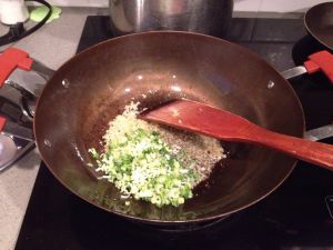绝招二:爆出葱姜香。将葱姜末放入还有余热的油锅。注意先下姜末,翻匀,再下葱末。比例一比一。注意:出味即可,别炒煳。