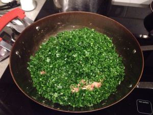 绝招五:菜与肉比例1:1。接下来就是放切好的白菜末和韭菜末。两者比例1:2,韭菜是2。我的白菜被韭菜压住了,没有拍照的机会了 哈哈!然后在和匀。
