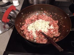 待锅温降到不烫手时,放入4倍的肉馅(我放的一斤)。加入适量料酒,老抽,盐,胡椒粉,少许白糖。和匀。