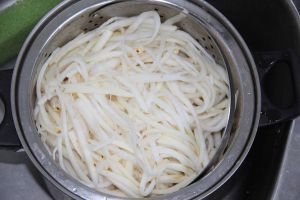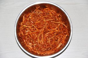 干桔梗泡发,多泡几遍,最好是泡一晚上,第二天用盐搓洗,少许即可,去除苦味