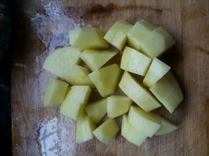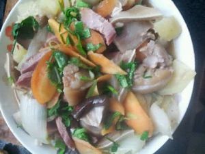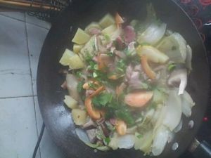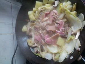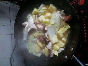 白菜,土豆,香菇一起入锅煸炒,加入水,盖上锅盖炖熟,中间可以加入一勺牛肉酱.有鲍鱼汁的朋友也可以加一勺提鲜.