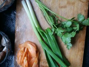 最后依次加入胡萝卜,大蒜,香菜,加少许芝麻油,白胡椒起锅.整个过程都不要翻锅,肉在蔬菜中间,找个大点的盘子一下子倒进去,会很好看.