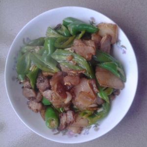 锅里放少许油,葱姜蒜爆锅,放入五花肉,快速炒出油脂,并炒的微焦后放白酒,生抽,青辣椒,翻炒后出锅。