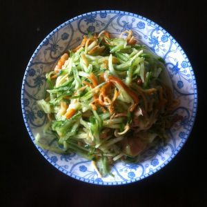 加入切碎的蒜末和一匙盐(根据个人口味),将黄瓜搅拌腌制