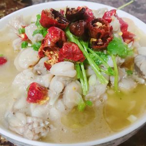 此时锅内放入腌制好的田鸡肉大火二次烧开20秒即可连汤一起装入碗中。